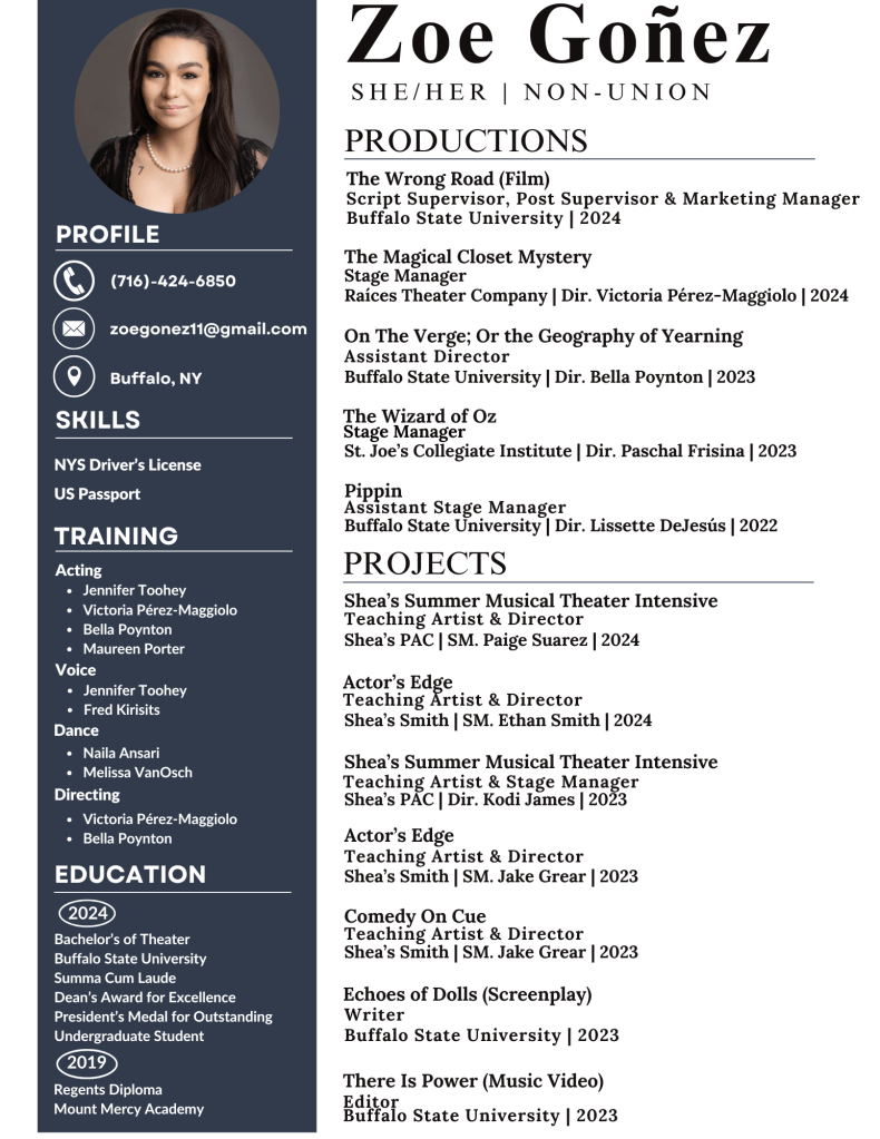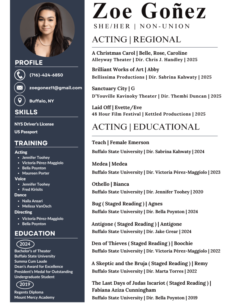 Below you will find two of my resumes. The first is my Performance resume which lists my training and experience on stage and in film. The second is my Production resume which outlines my experiences working backstage and behind the camera.
